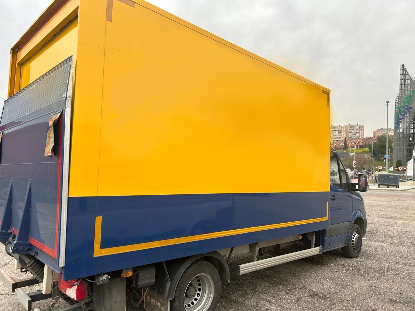 Vehículo para transporte de mercancías por carretera en España, con trampilla elevadora. Podemos transportar tus mercancías de hasta 2.000,-KG de forma segura y confiable.